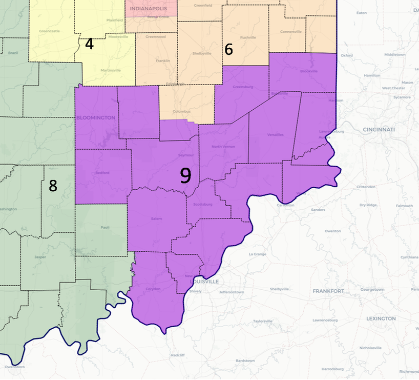 The Ninth Congressional District is composed of all or part of eighteen counties (Bartholomew, Brown, Clark, Dearborn, Decatur, Floyd, Franklin, Harrison, Jackson, Jefferson, Jennings, Lawrence, Monroe, Ohio, Ripley, Scott, Switzerland, and Washington ) in southeastern Indiana. Significant communities in the district include Bedford, Bloomington, Corydon, Jeffersonville, Lawrenceburg, Madison, Nashville, North Vernon, New Albany, Rising Sun, Scottsburg, Seymour, and Vevay.